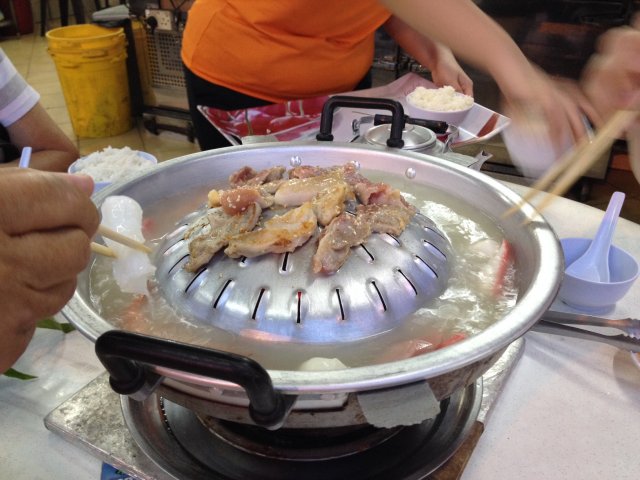 In any normal circumstance, you will hardly decide to make this venue the place for dinner. Not surprising since the interior looked so dimly lit that it seemed that there's nothing else selling at the coffee shop apart from the drinks stall. But there's where the appearance belies the potential to be another place of recognition for steamboat.Stumbled upon this place today when we were desperately looking for a steamboat venue to meet my wife's cravings. Having checked and turned away by many other steamboat restaurants (especially on a Saturday night), this place was discovered using HGW mobile app. Beggars cannot be choosers, we went there for our dinner. The initial appearance of course made us think twice on whether we should proceed (especially when there were only 1-2 tables occupied). Hunger and sense of adventure took over.For a start, don't expect the menu to have a wide variety of offering. in fact, you get a steamboat set at $38 plus any other additional dishes you would like (i.e. two kinds of appetizers, pork, chicken, bacon and pork liver.) Yes that's it. Naturally we went with the set (that came with the whole accompaniment of meat, egg, vegetable, prawns and sotong, pork liver, tang hoon etc) and ordered additional bacon and pork. The steamboat is in the form of a special kind of thai-style (?) steamboat combining BBQ and soup functions, heated by charcoal. The aroma of charcoal combined with seemingly MSG-free chicken soup surprised us, giving a hint of standards beyond mediocrity. When the set came, I spotted (and couldn't believed it), small slabs of lard. Yes, LARD. The proprietor explained that the lard is there to oil the hot plate. And by any natural rule of thumb in the world of culinary, lard makes anything, ANYTHING, tastes better. Boy, was I right. The ingredients used were all fresh and tasty. Pork and chicken meat were tender, prawns and sotong fresh without the dirt or fishy smell. I believe if they had offered fish, it would have been heavenly too just that fresh fish is so difficult to manage on BBQ. Oh, and the pork, chicken and liver were all coated with sesame seeds, adding that extra oomph when BBQing them. The surprise was how great pork liver can taste when BBQed as you get to cook the outer sesame layer without overcooking the liver interior. The result is great, strongly recommended! It was a regret that there was no more pork liver when we wanted more.We have also ordered the thai-style abalone appetiser (because the prawn appetiser is out-of-stock) and that tasted good too. Only regret that the appetiser came after the steamboat was started, kind-of defeat the purpose of an appetiser.I'll definitely visit this place again if I did not want to venture too far. In general it is a unique way to have a steamboat meal (see photo) and it doesn't stink up your clothes like many venues do. Advice: book a table in advance.…查看更多