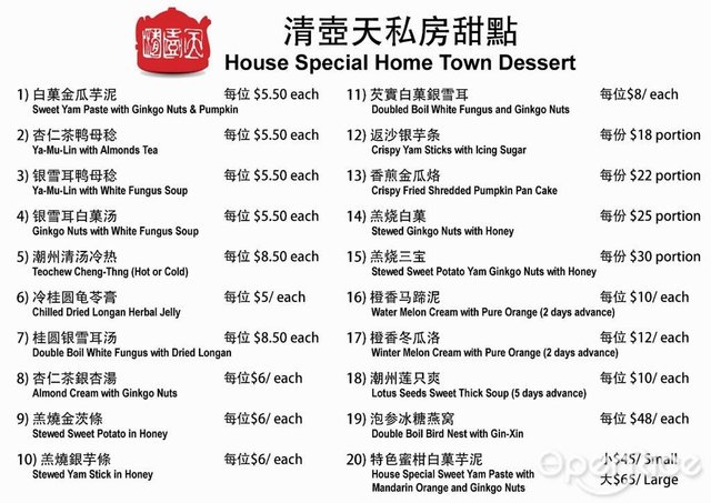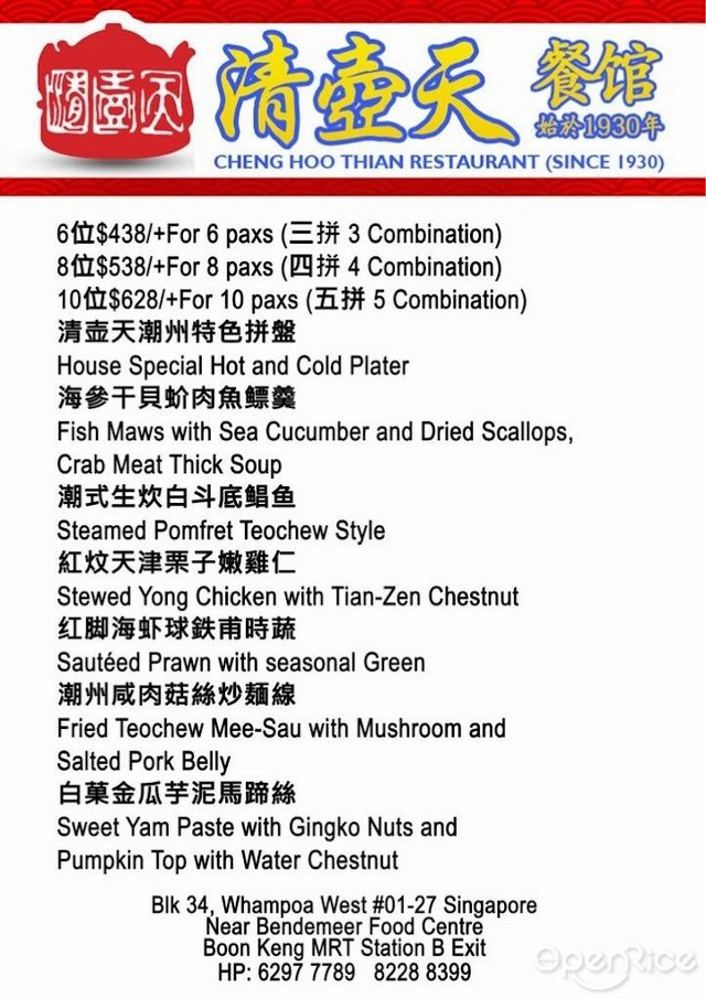 清壺天潮州餐館 (新加坡) 網址: https://s.openrice.com/eKbSB01Iva200 地址: 34 Whampoa West, #01-27, Bendemeer/Boon Keng, Singapore 電話: +65 6297 7789