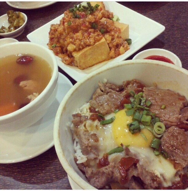 Wan chai hong kong cafe serves a variety of hong kong fare such as chinese noodles, fried rice, sandwiches EtcThis was my first time dining at this restaurant. Once seated, you will be given an order form to place your order and then proceed to the cashier to order the food. I decided to order a beef egg rice and a side dish of Fried Tofu with briased mincepork. The beef egg rice was served warm, in a small bowl. The rice is at the bottom and on top of it lies slices of beef with a runny egg yolk. The top portion of the rice was drenched in the sauce, the beef was soft and not dry at all, it was cooked pretty well. In my opinion, the best way to enjoy this dish is to mix everything together, so that the flavour will be balanced and you will be able to savour the goodness in every mouth. For the fried tofu, the skin was incredibly crispy and the inside was soft. The mincepork was flavourful and quite delicious too! Overall, i enjoy my experience dining here and will frequent this restaurant again.…查看更多
