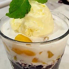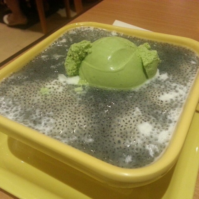 Basil Seeds in Vanilla Sauce with Green Tea Ice Cream