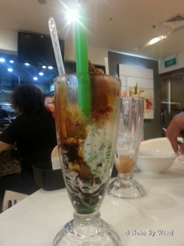 he first thought that came into my mind when the Chendol was served was 'so big serving, am I able to finish it?' I actually had Chendol less than 5 times in my life as I would normally order an ice kachang or other desserts in food centres. I don't remember seeing such large serving size of Chendol in food centres though. The first thing that caught my attention was the gula melaka. I stared at it in horror at the gooey pile resting comfortably, taking its desired shape across the ice. No way I wanted so much sugar intake that day! Besides that, the sight of those beans disgusted me as I am not really a fan of them. Worse still, now that they had got bigger. After mixing all up, as expected it was too sweet. I could not stand the sweetness and requested for more ice. With the extra shaved ice, the taste was just awesome. Fragrant from the gula melaka and coconut milk, chunky from the grass jelly and the green worm-like jelly made from rice flour. Not that I am fussy, but having too much jelly really irritated me as the drink should be the priority. …查看更多