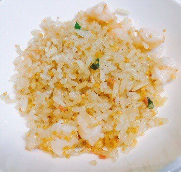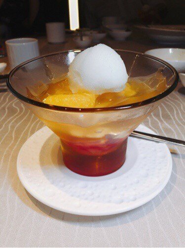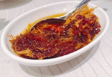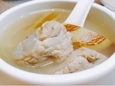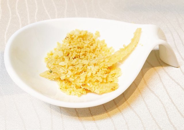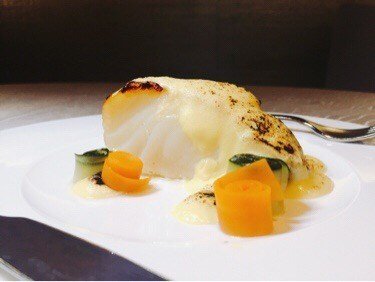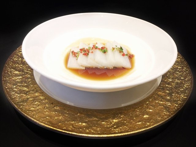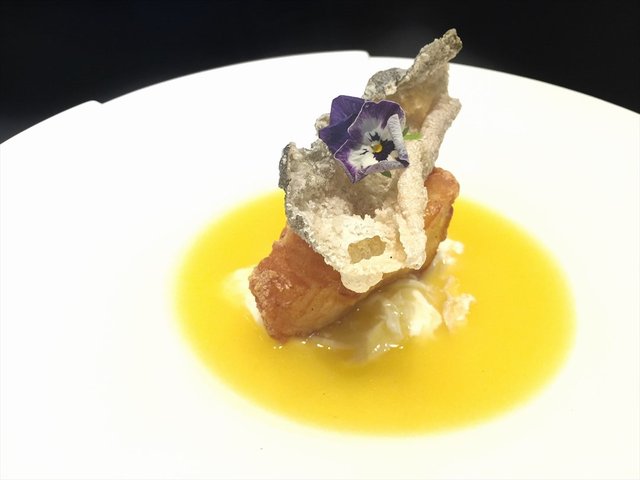 Deep Fried Chilean Seabass with Crispy Fish Skin served with Egg White Crumble and Golden Broth