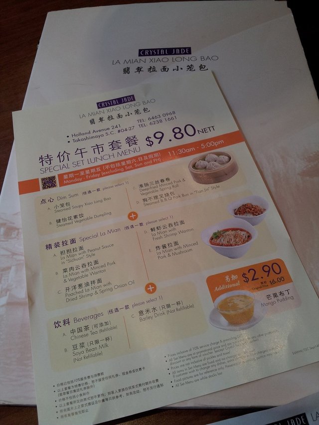 Weekdays are great when dining at Crystal Jade Kitchen! The $9.80 special set lunch menu is a steal and a value for money lunch choice. At $9.80, the set includes a la mian, a dim sum item and a drink of your choice. Three of us had three different la mian: the zha jiang la mian, the dry la mian in spring onion oil and the soup la mian with minced pork and vegetable wanton; and chose 2 xiao long bao and a deep fried spring roll as our dim sum items. We all had the very nice and warm soya bean milk! As a fan of their dry poached la mian with dried shrimp and spring onion oil, I chose that without hesitation, I love the fragrance of the la mian tossed in spring onion oil, oh so good! The other two la mian are also good and kept to standard. How can we go without their signature xiao long bao, it's so worth having the xiao long bao in this menu list of choices! The deep fried crispy spring roll is really yummy, and served fresh, hot and piping. It's my first time trying their spring roll and I really love it.This special set lunch menu is only available at two of their outlets, Holland Village and Ngee Ann City, and is only available on Mondays to Fridays from 11am to 5pm. But please note that the Holland Village outlet closes at 3pm for a break only to open for dinner later.…查看更多