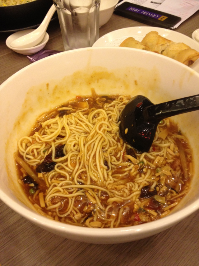 If you are looking for juicy Xiao long Bao, must go to Crystal jade! My all time favorite! The la main always come in a huge portion, and if you are a small eater, two person can actually share a bowl of la mian.The spicy cucumber did a great start as an appetizer! Cucumber was very crunchy, and the chili oil blend well with it and was really refreshing. I ordered the spicy and sour thick soup la mian. And guess what, the soup was really thick, more like gravy. There were a lot of dried chili flakes in it, but taste was okay, not too spicy. My friend ordered the la mian soup with shrimp wanton! The wanton was big and shrimp were very fresh! And we ordered 2 set of the famous Xiao Long Bao,total 8 pieces! The Xiao long Bao were very juicy, and were bigger in size compare to the one in Ding Tai Fung! Dipping the Xiao Long Bao in the ginger and vinegar was the way to eat it! But beware of your bite while eating Xiao long Bao, as the soup will gush out and might burn your tongue ! Then, we ordered another 8 pieces of pork dumplings with spicy chili sauce. Dumplings skin was just nice, soft and smooth! It was a perfect la mian dinner!…查看更多