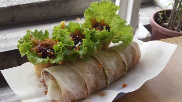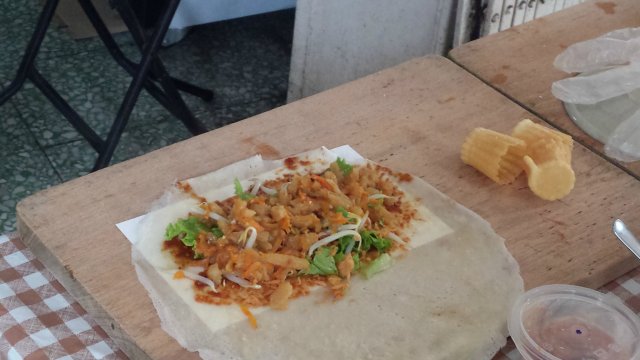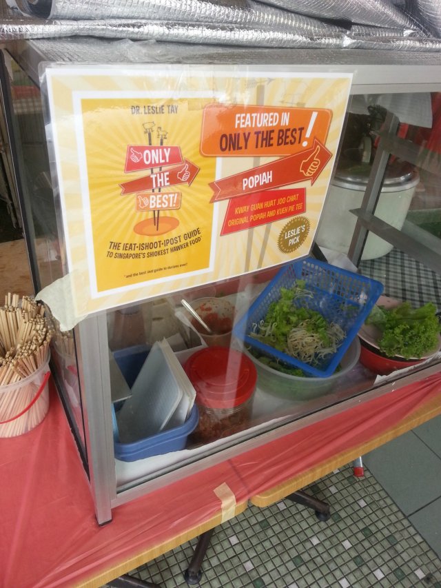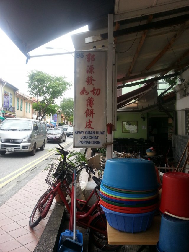 Located at the left side of the street, around 2 mins walk after Joo Chiat Complex, is where this humble little shop is. What I like about the popiah here is the popiah skins are homemade and this young chap made the popiah skin with his bare hand! Kudos to him.I ordered a popiah and kueh pie tee set ($4) which comes with 1 standard popiah and 3 kueh pie tee. Kway Guan Huat's popiah comes in many varieties. For the set we ordered, we have the standard popiah which doesn't not include egg or prawns. If you like your popiah with prawns and egg, then do order the premium ones. Overall I like the presentation of the set, simple and pretty, especially the kueh pie tee looks like 3 flowers beside the popiah. Taste wise, I find it rather ordinary. However I like the fact that the radish fillings are coarsely chopped which resulted to a more juicy mouthful experience which eating it. On top of that, perhaps it's due to the homemade popiah skin recipe, the thin translucent skin does not break easily as compare to those popiah outside. So I feel that it's quite a good idea to order those DIY Popiah party set from them during gathering and such. Do give them a try if you happen to be at Joo Chiat area. However if you find Joo Chiat too far, they have an outlet opened at the newly revamped Tangs basement too, at a slightly high price tagged.…查看更多
