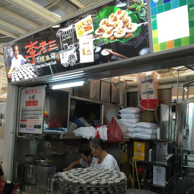 Ghim Moh Chwee Kway 锦茂李老三 located at Ghim Moh Food Centre at near Buona Vista MRT station is operated by a couple. The couple (Mr and Mrs Lee Sah Bah) has been selling Chwee Kway since 1959 and is well-known among residents staying at this area. Price ChartThe prices of the Chwee Kway 水粿 are clearly stated on the price chart at the facade of the stall. Mrs Lee partially hidden by the stack of Chwee Kway in their metal moulds laid out on rounds boards stacked on top of one another!Chwee Kway is essentially a steamed rice cake topped with diced preserved radish. At this stall, the owners make everything by hand, not machined made. This means that they have to wake up at 5am every day to start the preparation. In addition, they made the preserved radish (chye poh) differently from other stalls by just stir frying it for 2 hours with onion, garlic and pork lard (without sugar). As I was taking photos of the facade after having made my order, Mr Lee, 63 years old suddenly popped up (in front of me) and proudly showed me his City Food Hunt 2013 certificate which he just received! I could sense his pride and joy. With more than 54 years in this line of business, it was not an easy feat! Kudos! Many more years to come! Chwee Kway $1.20Chwee Kway $1.204 pieces of Chwee Kway for $1.20. Unlike else where, you get toothpick(s) instead of fork or spoon. Chwee Kway $1.20The Chwee Kway was not bad; soft yet firm. It was tasted pretty much the same as those at other stalls. What was unique was the chey poh.When I got the Chwee Kway, the first thought that went into my mind was... Aiya, auntie give so little chye poh. After eating all the Chwee Kway, I suspect that the reason was because the way their version of chye poh was more salty. Beside being salty, their chye poh was oh-so fragrant (must be the pork lard)!! Hence, the amount given was sufficient.Worth a try. http://foodiefc.blogspot.sg/2014/01/ghim-moh-chwee-kway-ghim-moh-food-centre.html…查看更多