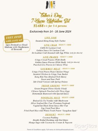 招牌黃金蟹(南瓜汁) / 上湯焗龍蝦煎米粉底 / 蒜蓉蒸鮮活貝 / 紹興醉鮮蝦 / 砂煲福建麵 / 椰子布丁