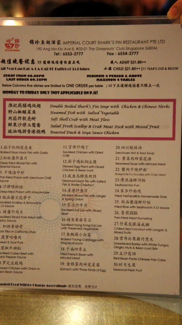My good friends & mei mei arranged a dinner for my wife & i at imperial court restaurant at the grassroots club on 5.11.2015. ^^i have wanted to try the gimtim group of restaurants but have not done yet, so this suited.they have a 1/2 suckling pig set for 6. we had 7pax so my friend ordered 2 additional dishes.the #1 half suckling pig was a large helping. it was much larger than what i had at ah yat & other places like hung kang & summer gardens.i thought ah yat’s suckling pig was very good but this was equal or better & much bigger portions by comparison.it was extremely good, very crispy skin & very flavourful, tasty meat. it seemed to be a combination of the 片皮 & 南乳 styles. usually the 片皮 style came with wraps & the 南乳 comes with the meat. my wife & i prefer the 南乳 style.the next dish #2 (quite poor) fish maw soup though was quite poor.no comparison like the one at beng thin.my friend ordered 2 additional dishes=#9 addition sanpei chicken 三杯鸡 dish & #10 additional beef dish.sanpei chicken 三杯鸡 was so-so, maybe below par. the beef was pretty ok, not the very tenderised chinese style beef which i don’t like.the #3deepfried seabass in thai sauce was very good.the sauce was not the usual thai sweet sauce (best for deep-fried chicken wings) but a bit tangy.a very good fish dish by my reckoning.the #4 abalones with broccoli dish was the usual good standard, with nice broccoli & mushrooms.i love #5 the steamed scallops. i think they were the best! ^^usually i prefer steamed razor clams to steamed scallops because usually steamed scallops get overdone (i don’t know why?).these ones were very tender & sweet & tasty. excellent is the word!the #6 prawns were nicely done, fresh, tasty & crisp.i don’t like the sauce though, just overly sweet.the #7 braised seafood beehoon was very tasty.& with good ingredients.reminded me of my own crabless beehoon!the simple dessert of the day = #8 fruit cocktail dessert with ice shavings was very refreshing.overall an excellent dinner. i liked the suckling pig & the steamed scallops.i estimate the dinner to cost about S$350nett, so about S$50nett.service was very good. the servers took several photos for us & also went digging up a knife & candles for the cake.it was a really fun evening.a truly wonderful time with close friends & great dinner.See my full reviews & photos at = http://chefquak.com/2015/11/12/wonderful-dinner-treat-by-our-good-friends-imperial-court-on-5nov2015/…查看更多