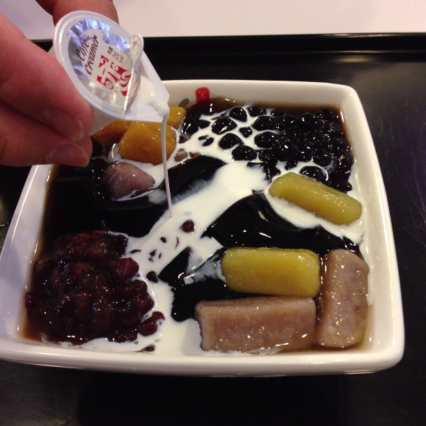 Pass by this dessert stall and saw the long queue and decided to give it a try. I have bought their BlackBall Signature under the take away packaging. The black balls,including the tapioca balls, yam balls are all very chewy and not too sweet. The black jelly inside, which taste quite similar to the grassjelly, is also not too sweet too. The icy texture does not bring much special taste to it, just like normal ice kachang. At the price of $4.95 per bowl, is cheap and affordable. The stall is neat and staffs are quite pleasant and good.…查看更多