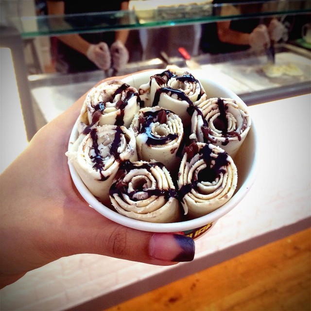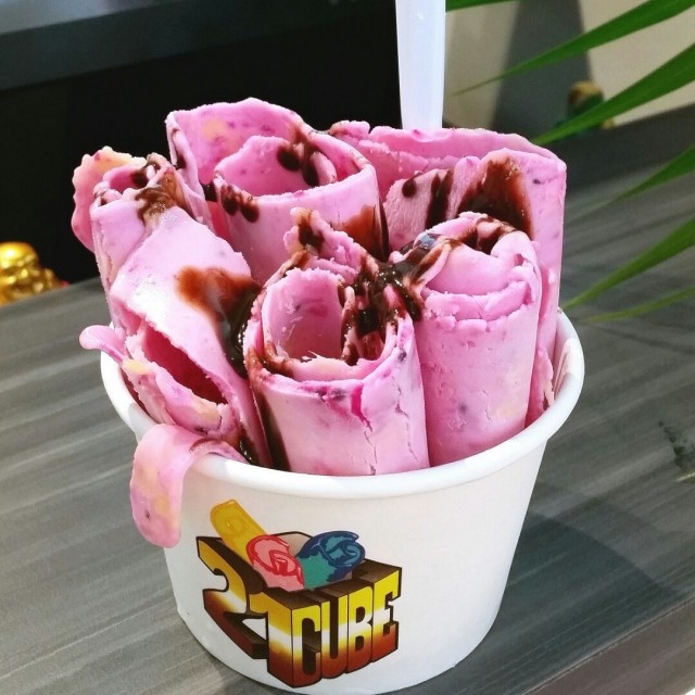 At 21 Cube, you get the freedom to customize your own stir-fried ice-cream; you can first order a base flavor, add in mixers like oreo or fruits to your ice-cream and finally top if off with a syrup of your choice.