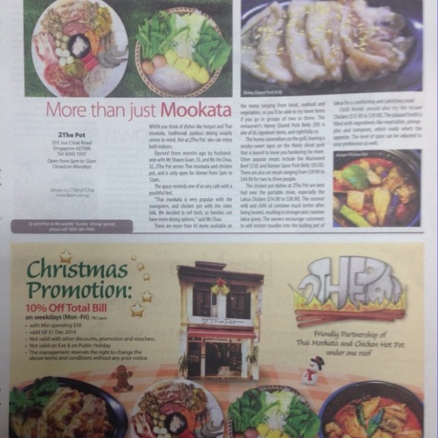 It is a honor to be invited by OpenRice for the food tasting invitation at 2ThePot.Chicken Pot, as well as Mookata are 2 very popular dishes in Singapore. Many a time, people flock to find the best of these 2 dishes all around Singapore.Now, I will say, you will have the best of both worlds to savor both dish styles under one roof! Joo Chiat Road; this place is a food heaven for diners, especially Vietnamese cuisine and splattering dots of pubs and cafes around the vicinity.One will be surprised to find a Chicken Pot and Mookata place here. Yup, I daresay 2ThePot is the first and only restaurant that serves both delicacies here. :)The interior is pretty white, neat and rather spacious.The staff was very friendly and accommodating, which is a plus point. Keep it up!Food came in no time.Appetizer.... an Indian cracker called papadum was served. Wow, that sure was a surprise.... wasn't expecting an Indian appetizer to kickstart this interesting meal journey.  You can dip the papadum into the sweet yet slightly sticky chilli sauce. Interesting concotion for the chilli sauce, which is not your usual Thai sweet chili that is watery, but this contains sesame seeds, chilli, and a celery, no fish sauce base though.Thai Iced Tea came next. Pretty awesome I must say, comparable to the ones you may find in Thai cafes or the road side drink stores in Thailand.First up, Spicy Chicken Pot. Impressive array of ingredients can be seen here, especially the long uncut chilli! Looks hot! The gravy is a little too salty , chicken sizes are perfect, and soft to the bite. Not as spicy as it may seem, I will say if you are looking for a spicy kick, this is not the one to go for. With so much gravy, rice will be a good option to go with this.Rating: 3/5Mookata, the one everyone was waiting for! It's up and coming next. I will say the Mookata served here was pretty good, especially the fresh ingredients offered.Not too much, not too little. My only comment for this is that the tom yum soup is not spicy enough. Nevertheless, I guess the owner is catering this for the local community.Rating 3.5/5Laska Chicken Pot is up next, and I will say, this has to be the best dish of the day!Thick and awesomely coconut milk rich, this is heavenly stuff. Served with chicken pieces, tau pok, fish cakes, and some lemongrass inside, wow!Rating: 5/5Next up is Assam Chicken Pot. From first look, it sure looks very identical to the Laska Pot, apart from the ingreditents. Fresh big pieces of chickensimmered in the Assam looks fabulous. The letdown of this dish is the saltiness and lack of the Assam taste!Rating: 2/5Other side dishes that came along:Thai Fish cake - Big piece, but lack the spiciness and a little hard Rating 2.5/5Fried mini buns - A winner to compliment the Laksa Chicken Pot.Rating: 5/5Marinated Beed and Korean Spice Pork Belly - Very well marinated, and goes very well with the Mookata.Rating 5/5Check out our setup for the dinner!Overall, I will say there is much for improvement on the dishes. More spiciness, as well as lesser salt on all the dishes. Keep the winning formula of Laksa Chicken Pot, and focus on improving on the taste for tom yum soup for Mookata, more spinicess on Spicy chicken Pot, and in my opinion, scrap the Assam Chicken Pot. Improve on the texture for Thai fish cake, and keep the winner side dish of fried mini buns.For more food reviews and pictures of this food review, please visit my blog at https://pumpuileo.wordpress.com/Read More