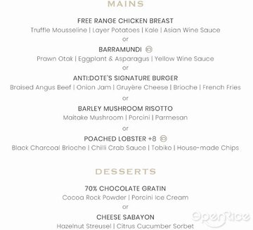 For full review - http://midas400.blogspot.sg/2014/12/afternoon-tea-at-antidote-fairmont-hotel.htmlIt has been a while since we last had hi tea on a leisurely afternoon like this, sipping tea/coffee and catching up with sistas over delicious nibbles. So here we are at Antidote, Fairmont's new snazzy cocktail bar by the lobby to enjoy their new Afternoon Tea menu.They have beautiful crockery sets for afternoon tea, perfect for the ladies! The Afternoon Tea set $38++ ($75++ with a glass of champagne) comes with a choice of beverage (free flow), from a selection of premium TWG Tea, Gourmet Coffee and Chocolate drinks. I had the Hot Chocolate, and it was good!TWG TeaHot ChocolateCappuccinoThe food menu has 3 variants, Antidote tea with Black truffle scrambled eggs & butter toasts as starters, while the Oriental tea has a 3pcs Dim sum set (Shrimp har gau, Chive dumpling & Scallop siew mai), and the Regal tea ($75++) has the Smoked salmon w/ caviar, blinis, crème fraîche for starters. The rest of the sweets and savories are the same.Two of our sistas picked the Scrambled eggs, which comes nicely presented in an egg shaped holder with the egg shell intact. Feedback from them, the egg was very creamy and toast sticks were a tad oily if eaten alone w/o dipping into the egg mixture. Overall still quite nice when taken with the aromatic black truffle.I am not a fan of creamy buttery stuffs so my choice is the Oriental set, and the handmade dim sum morsels stuffed with premium ingredients were superb. The bamboo basket was served on a pretty Jap style tray...cool.When we're done with our starters, the waiting staffs then serves up the most anticipated Sweets and Savories tea set in an exquisite white leather jewelry chest. At the top of the chest is a reflective mirror duplicating every hand crafted item into two, an extremely genius way of presenting intricately made desserts. Hidden in the individual drawers were savory finger sandwiches & rolls, scones, pound cakes and cookies, all laid out in an eye pleasing manner. Photo taking frenzy ensues...Let's check out what's available in the chest for tea!On the top Strawberry gateau, raspberry, lychee pearlApple delight, almond crumbleKarukera chocolate mirror tartEarl grey éclairAntidote rum babaChocolate-dipped strawberriesHandmade trufflesYuzu macaronsThe desserts are almost too pretty to eat, I personally liked the Karukera chocolate tart, Strawberry gateau cake, Apple almond crumble and Chocolate-dipped strawberries. The rest are not as impressive as they look, especially the Antidote rum baba and Yuzu macarons were way too sweet for my liking.First drawerSmoked salmon, crème fraîche, caviarBoston lobster roll, herb mayonnaiseCucumber and dill salad, cream cheeseProsciutto, onion jam, aged cheddarCoronation curried chickenThe savories were better, other than the Cucumber sandwich with cream cheese which I don't eat, all of the rest were really delish, and my fave was the mini lobster roll.Second drawerWarm raisin Scones & Candied ginger Scones and Lemon basil pound cakes.The ginger scones were a nice change from the usual ones we see from regular afternoon tea, the ginger fragrance lingers on the palate a little, quite a delight to eat even though it was buttery, I musk the smell with the tangy lemon curd and yummy strawberry jam. The Lemon pound cakes were great but rather sweet though.The last drawer contains Homemade strawberry jam, Devonshire clotted cream & Lemon curd to compliment the scones, and two individually wrapped cookies for takeaway.Although the food are not replenishable, one set is enough to fill a regular lady's stomach, all of us were feeling very full at the end of the tea session. At $38++, this is one of the more wallet friendly afternoon tea in town. If you like more sweets than savory, I would highly recommend this place, else I would suggest my current fave afternoon tea place, The Landing Point (Fullerton Bay hotel) for a more balanced sweet and savory mix afternoon tea menu.查看更多