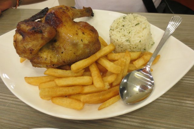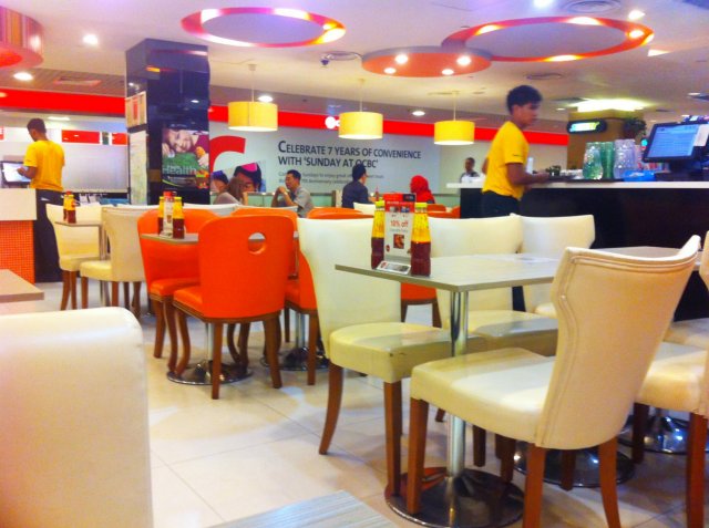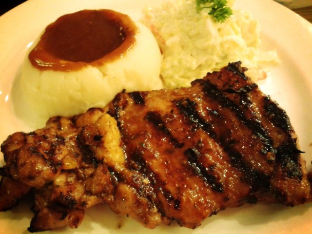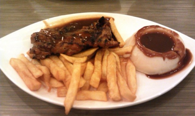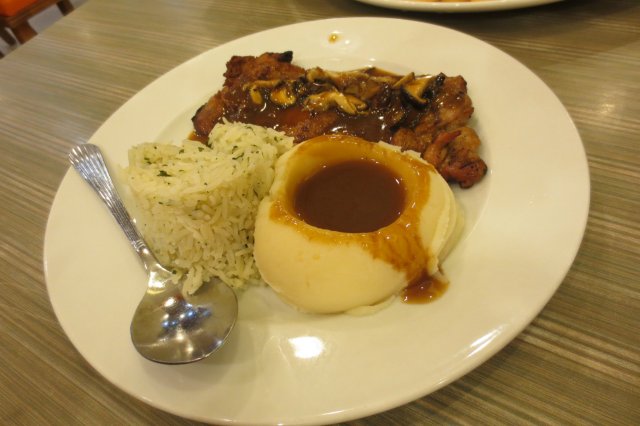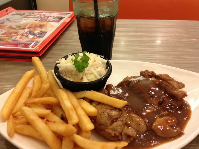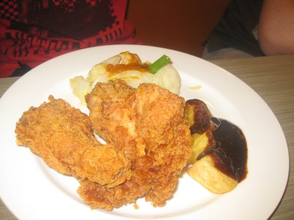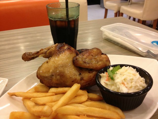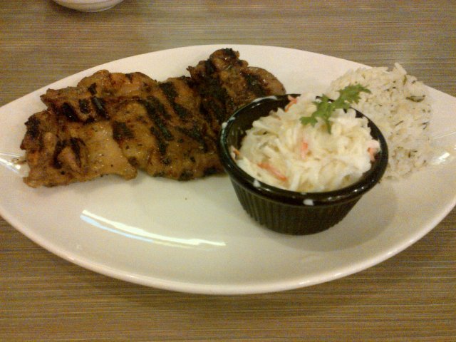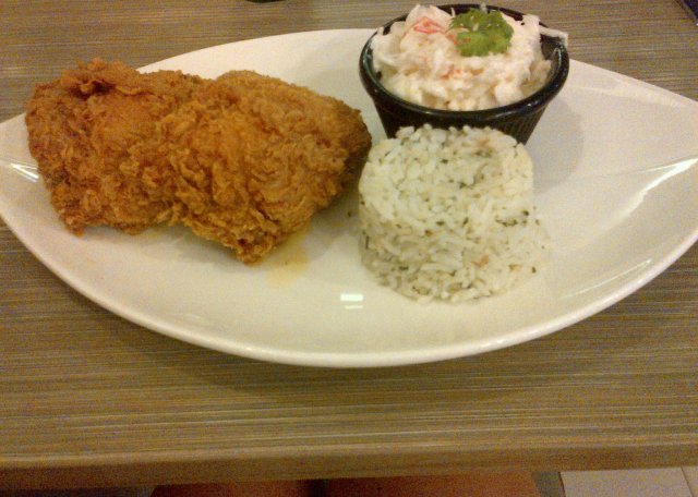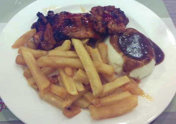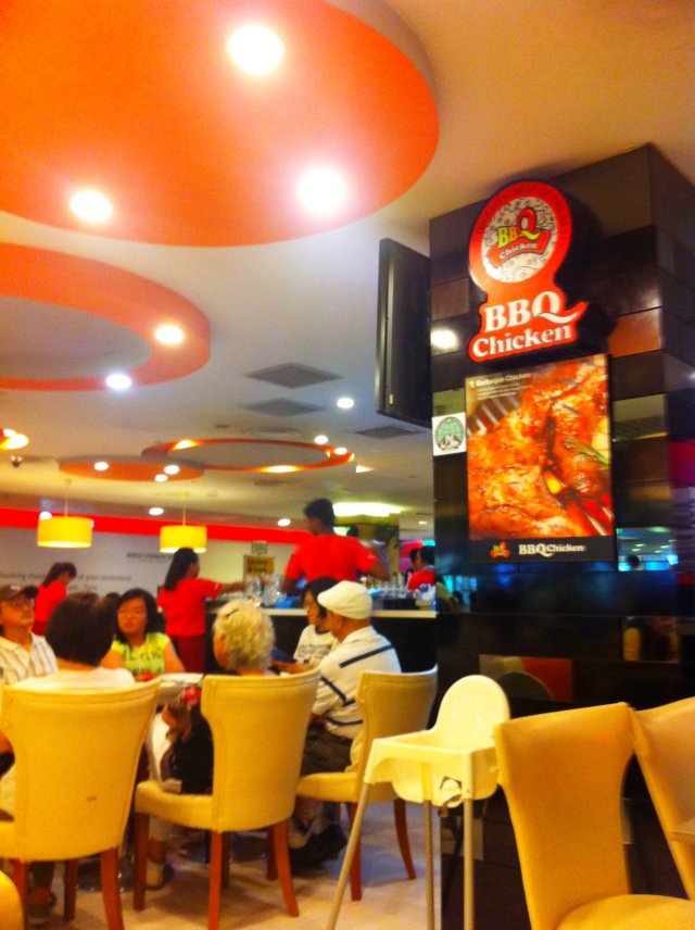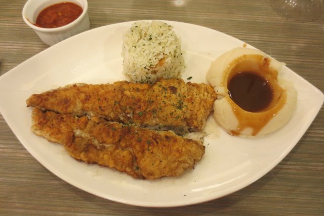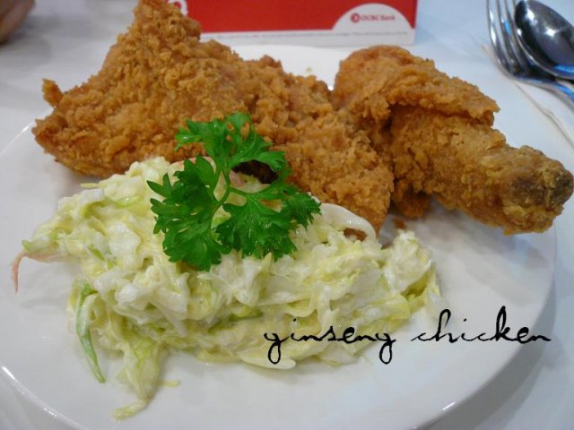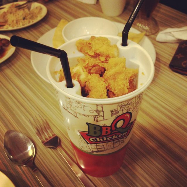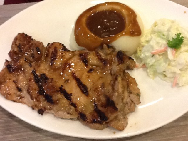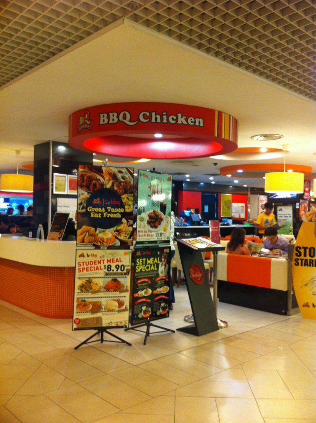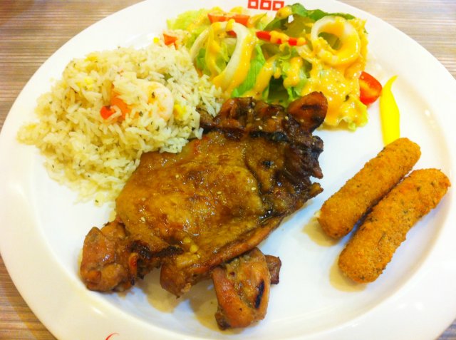 BBQ Chicken is a Korean chain which known for its chicken dishes made with 100% olive oil. Over the years it is has expanded to a number of outlets in Singapore. At Northpoint shopping centre, there is an outlet too. Here it is an open concept restaurant. The restaurant is simply in red and white.Cutlery is served in a box after we are showed to our table. Water is served here free of charge. The staffs here are quite quiet. But are also quite helpful when needed.Korean Traditional Charbroiled ($16.50++)Seasoned and grilled thigh marinated with special Korean style herbs.Since it is a Korean restaurant, we order a chicken meal dish to try. It is served with 2 side dishes which I select shrimp olive rice and cheese stick. The rice is tossed with 100% olive oil, parsley, garlic, onions, seasoning, topped with a shrimp and tastes quite light. The cheese stick is not the flowing with melted cheese type which I prefer. Instead it is a hard cheese block inside. The grilled chicken is flavourful but a bit dry inside and oily outside.Sous-Vide Chicken Nasi Goreng ($9.50++)Nasi goring with tender grilled sous-vide chicken in fusion style.For a simple dish of fried rice, efforts has been to make it look so colourful. A side dish of crunchy prickled vegetables hanging by the bowl, opens up my appetite. The sliced chicken is surprising quite juicy and soft here.Spoon Pizza (Sous-Vide Chicken) ($17.50++)Secret dough recipe of pizza topped with sous-vide chicken steak.Here the restaurant has quite a unique way of serving pizza that is so soft that it can easily cut through with just a spoon. The base of pizza is so soft like a pancake. The pizza is quite cheesy and also surprising sweet as if it is coated with a layer of maple syrup. There is also traces of mashed potatoes inside the pizza. The chicken topping is also quite juicy here. Total this meal costs $51.20. Overall quite a tasty and filling meal. Best of all the place is not crowded.…查看更多