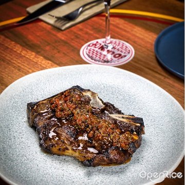For the complete review by Chubby Botak Koala, click / copy the link below:http://www.chubbybotakkoala.com/2015/06/bochinche.htmlBochinche, an Argentinian theme concept deli and restaurant. A collaboration between Spa Esprit Group with Argentinian born Chef Diego Jacquet. It seems that Cynthia Chua and her team are the people with the golden touch when it comes to new F&B concepts in the market. Bochinche is located in the same building as Common Man Coffee Roaster, which is also owned by Spa Esprit Group. Once you entered the second floor, you will be welcomed with huge paper carcases as if you are entering a butcheries. Of course no major scale butchering happen here, instead you will see the range of Argentinian products. Our brunch stated with Watermelon Salad ($13). Our favourite cheese was on it. Beautiful Mozzarella with extra chilled watermelon cubes are just refreshing. The sliced tomato, micro herbs and toasted seeds provided the contrasting texture and flavours to the dish. Yum Yum, good start. Chimichurri Burger V2.0 ($29) and Bife Ancho Rib Eye Steak ($55 for 300 gram) are our main meal. Together with Provenzal Chips ($10) on the side and Béarnaise sauce ($5). Chimichurri is a common sauce use in Argentina to marinate or to accompany the meat. Made of finely chopped parsley, garlic, olive oil, oregano and white vinegar. Normally each family will have their own family recipe for this sauce and each one will tell you that theirs are the best. This sauce paired well with the burger as the acidity and herbs balance the fats in the meat. The patty is tender and juicy. The deep orange colour of the yolk just scream BITE ME!!! However, watch out for the extra pungent provolone cheese which did not bode well with us. The beef from the Rib Eye originated grass fed cattle in Buenos Aires, hand selected by Chef Diego. Our first encounter with Argentinian beef was a memorable experience, so we have no doubt this one will be the same. It is nicely charred, cooked to medium rare. It has a nice marbling to it, tender and succulent. I say it is comparable any US or Australian grass fed beef. The provenzal chips was well seasoned and a good pairing for the steak. Crispy on the outside, yet moist inside. It is definitely better than normal fries. It is also good as a beer snack. Service was friendly, attentive and have a good understanding on the menu. The décor of this place is very casual, whimsical using solid wood as the main theme here. Indoor and outdoor seating are available, my suggestion is that watch out for what's written in the back of the seat cover and have a good laugh. For the indoor seating, Bochinche have two long bench seating beside the usual dining tables. On one side you can see the chefs at work, while on the other side, the bartender will provide the entertainment during your dining. Overall, our dining experience in Bochinche was a positive one. The food, service and atmosphere is just dandy. We really look forward to our next visit here and try our their dinner menu. Salud!!! Cheers!!!…查看更多