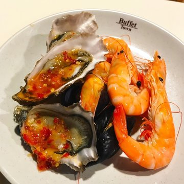 My colleagues' suggestion is to go to Buffet Town located at Raffles City Shopping Centre to try out the buffet. The restaurant serve wide variety of choices for buffet such as oysters, scallops, sushi, crabs, mantou, cooked items, prawns and as well as desserts such as cakes etc. We liked the seafood e.g prawns was big , fresh and juicy and oysters are fresh and big. The cooked section with crabs cooked with chilli gravy taste fresh and spicy with fried mantou to dip in the sauce. They serve different kinds of soups etc mushroom soup where you taste creamy and bits of mushroom in soup.…查看更多