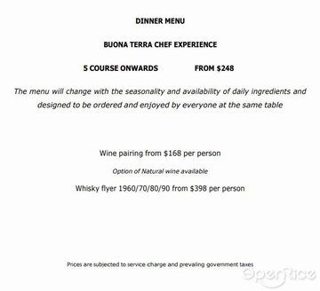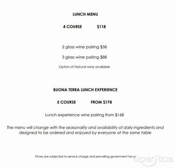 Buona Terra 供應由大廚 Denis Lucchi 個人構想打造的現代意大利美食。它從意大利所有地方的“美食儲藏室”開始,主廚 Denis 知道那裡有最好的生產商和他們的食品。這些珍貴的手工原料和主廚 Denis 伴隨成長的意大利食譜是烹飪藝術和冒險的起點。正因為如此,主廚 Denis 重新詮釋了比傳統菜餚更複雜、更濃郁的風味,將它們單獨呈現,與通常的共享拼盤形成鮮明對比。