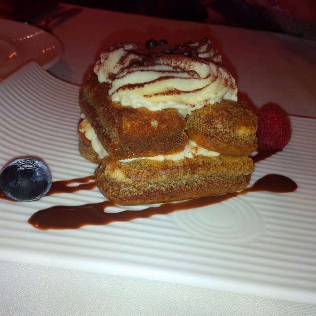 Having been to Caffe B. a couple of years back and enjoyed myself tremendously with the palatable food, impeccable food and elegant settings, I decided it was time for a revisit - this time with *Charmaine for her birthday. The pillar with wine bottles still greets us at the door, and the interior is still as beautiful as ever.For mains, we took the recommendation of Risotto "Singapore" (SGD$38.00) - chilli crab inspired risotto with giant scallops. The huge arborio grains were chewy and solid, giving the dish a wonderful bite. As for the chilli crab sauce, it was distinctive in flavor and crab's unique sweetness, but not too spicy - even *Charmaine who had sore throat was able to handle it well. The giant scallop was succulent and bouncy in its freshness, the perfect choice for this dish.We also shared the Angel Hair Pasta (SGD$33.00) - consisting of capellini tossed with veal jus sauce, truffle oil, edamame and Hokkaido pan-seared scallop. Imagine springy pasta infused with the rich flavor of veal jus and truffle oil - a very tasteful combination. The juicy scallop and crunchy edamame completed the dish; it was tempting to order another of this but of course we refrained.Finally, we had dessert - Tiramisu (SGD$18.00) - the classic Tiramisu done a la Minute. They were so lovely to serve this as a complimentary dessert because we were celebrating *Charmaine's birthday. The Tiramisu was moist, soft and tasted distinctively of the sweetness of mascarpone cream as well as Amaretto infusing its spongy layers. It was very good, but I was a little saddened it was not the same Tiramisu I had 3 years back, with the biscuit fingers. For more information and full review, please feel free to visit:http://thearcticstar.blogspot.sg/2015/05/dinner-at-caffe-b-mbs-revisit.html…查看更多