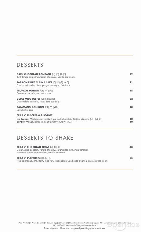 CÉ LA VI (新加坡) 網址: https://s.openrice.com/eKbSB01fxq100 地址: Marina Bay Sands Skypark, Hotel Tower 3, Level 57, 1 Bayfront Avenue, Marina Bay, Singapore 電話: +65 6508 2188