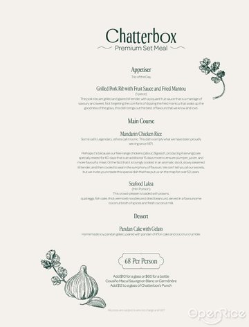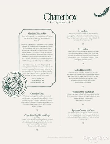 Synonymous with its world-famous chicken rice, Chatterbox was the talk of the town when it first opened in 1971 at the former Mandarin Singapore. An endearing icon that has stood the test of time – including several waves of refurbishment over the years, Chatterbox has been feeding hungry diners and satisfying discerning palates with its inimitable menu of well-loved specialities prepared with time-honoured and fiercely-guarded recipes. Firmly establishing itself as a prime and quality dining destination, it has remained a top pick for many years, among generations of Singaporeans and tourists who relish the well-executed Asian and local cuisine at this stalwart coffee house set in a five-star hotel.