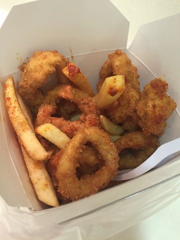 Located at the basement of the shopping centre, there were various food outlets for quick bites. One of them is Chippy which offers british food fare such as the traditional fish and chips, and sausage with mash for takeaway. But its most well known item on its menu would be the Fried Mars Balls. Sounded quite sinfully and naughty, but it was a hit with the old and young. Recently Chippy has gone through a rebranding and reopened with a new look.Fried Crumbled Calamari and Fries ($8 /combo)For combo set, it was served with a bottle of lemonade. The lemonade was sour and not too sweet, with a slice of juicy grapefruit on it. The fried crumbled calamari and fries was served in a chinese wire handle take out box, which one usually saw in US dramas, but not common in Singapore. It was quite unique.I had requested no chilli powder on the calamari and fries, yet the serving was covered with the spicy chilli powder when I opened the box. So sad.The batter was light and crispy with chewy calamari inside.The chilli sauce and mayonnaise was served in a separate container, but I did not use it as the food was already quite spicy for me.Fried Mars Balls with Ice Cream ($4.90)The pipping hot crispy balls were drizzled with chocolate sauce, served on top of the ice cold vanilla ice cream. If you did not like vanilla ice cream there was also a choice of chocolate ice cream. Encased in a thin crispy batter, the balls were filled with layers of gooey thick caramel and rich melted chocolate. Super sweet and yummy. It was an explosive combination of sweet, hot and cold with the ice cream in the mouth.Overall the food was not bad. Except for the mistake with the chilli powder on my order, the staffs were quite friendly.…查看更多