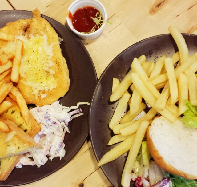 cheesy chicken cutlet, cheeseburger