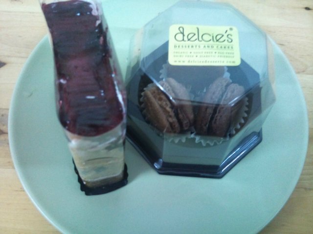Being a strict vegetarian, I do not have the luxury to consume cakes, as cakes usually contain eggs. However to my pleasant surprise, I came a across Delcie's Dessert and Cakes in Fortune Centre. This is not your ordinary kind of cake shop. Delcie's Dessert and Cakes is especially cater to vegetarian and vegan. This is because their cakes do not contain eggs and dairy. Not only that, their cakes and dessert is diabetic friendly too, as they use all natural ingredients in it.All their cakes look so yummy and colorful. To satisfy my sweet tooth craving, I bought a piece of Black Forest cake and a small box of Chocolate Macarons. These cost me about $15. Well it is not cheap, but if you want something special, you definitely have to pay for it.Taste Verdict: Super sweet. Definitely satisfy your sweet tooth !!…查看更多
