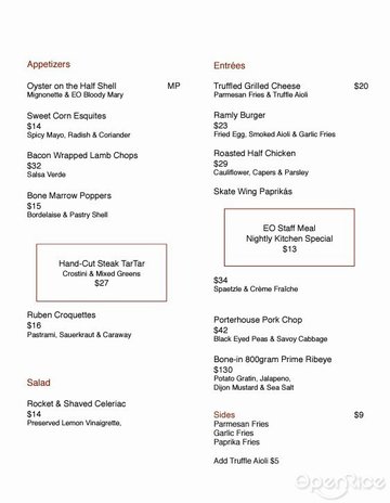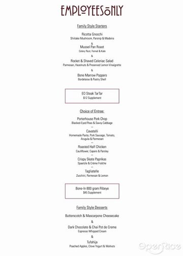 Hand-Cut Steak Tartar / Eastern European Charcuterie / Chef’s Cheese Board / Porterhouse Pork Chop / Bone-in 800g Prime Ribeye / Employees Only Staff Meal