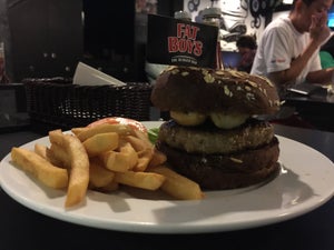 Was craving for some authentic US burgers so we decided to drive by Fatboy's at Pasir Panjang. There's a public carpark right beside the place so it's not difficult to find a parking space though the shop is facing the big road. There's a bus stop right infront so it is still accessible to reach the place.As usual, was spoil with choices of the different kinds of burgers served there. Decided to order their "Whimpy" Burger and "The Jamaican Me" The whimpy burger (beef) is the smaller version of their fat bastard. Specially opt for the honey oat bun instead of the usual sesame bun. Turn out the bun is too hard to bite (haha) and i still prefer the sesame bun in the end. There's also a frying egg and bacon to go with the burger.I prefer the Jamaican me. Consist of a pork patty, coslaw and bacon. Their patty is very salty though, but it's still moist for the pork patty. Overall i still prefer swensen's burger compare to fat boy's.…查看更多