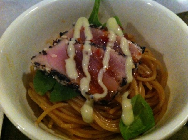 for photos and more reviews, visit http://thelittlemomentsofmylife.blogspot.com/ (:we were served a complimentary plate of crispy, lightly seasoned bread with an accompanying mayo-ish kind of dressing. i actually liked the bread without the dressing! it was tasty on its own (:the tuna and capellini was a really delicious and healthy looking pasta! (: look at the amount of veggies, so yummy! the tuna sashimi was delicious - tender, with some bite to it and so fresh. even steph who HATES sashimi said it was not bad! which means it had to be really good xD the capellini was smooth and al dente, simply wonderful.the pepperoni pizza was a contrast to the spaghetti. it was meaty. just carnivorous xD it was beautifully seasoned with herbs that complemented the strong flavour of the pepperoni and the chilis added a fiery kick to the dish. the bread was nicely crispy and thin, so that it wasn't too filling.finally, we had the char-grilled sirloin steak wrap. this was simply oozing with juice from the beetroot then went perfectly with the medium-rare steak. the meat was really tender and delicious. and don't get me started on the fries! i nearly polished off the entire pile single mouthed-ly