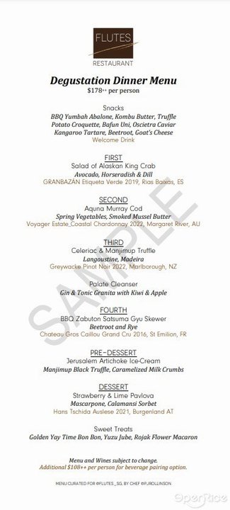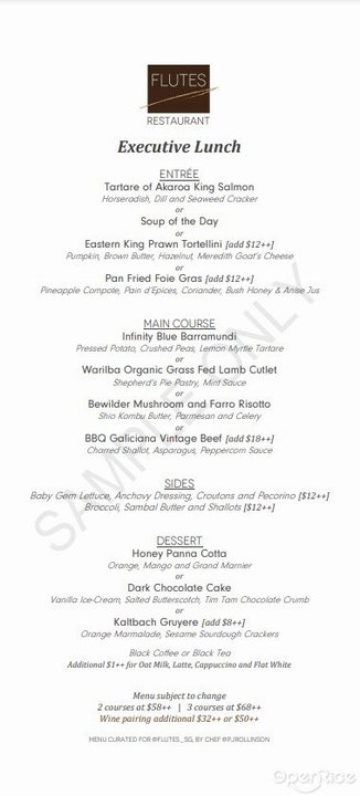 Full Flutes Restaurant Bar review here: http://ivanteh-runningman.blogspot.sg/2014/04/flutes-restaurant-bar-tasting-session.htmlSince 2004, Flutes Restaurant Bar has been associated with old world / colonial elegance, offering a smart casual dining experience with great food and wine in historic settings. And yes, they do hold events, with weddings beings especially popular.Framed by the white walls of the National Museum, Flutes Restaurant Bar exudes a charming and elegant sophistication. Large windows allow the interior to be lighted naturally, while the artistic touches along the ceiling draw the eye. Furniture is thoughtfully laid out, comfortable and allows for excellent dining conversation.Service at Flutes Restaurant Bar is friendly and discrete, you almost don't notice that staff are there serving you! I liked that they check politely for meal choices, as well as offering more drinks when they notice you're almost out. I also liked that they check on your meal, and take feedback well.Food at Flutes Restaurant Bar revolves around British English and Australian inspired cuisine. Dishes are generally tasty and well portioned for one, presented beautifully and feature fresh, quality ingredients. Not surprisingly, prices reflect the fine dining standards here. Flutes Restaurant Bar is also known for their extensive list of mostly Australian wines.We started with an Italian inspired Sun-Dried Tomato Bread with olive oil and vinegar dip. Freshly baked in-house, this was fragrant and soft, lovely to eat!Loved the Smoked Salmon Rosettes appetizer! The salmon was nicely smoked and meaty, and the beautifully crafted blinis were soft and fluffy. Paired with micro greens, zesty grapefruit, salty bottarga (cured fish roe) and thick creme fraiche, this went down a treat.The Cream Of Mushroom With Truffle Oil And Chives soup is extremely satisfying. The fragrance of truffle oil lends a rich earthness, while the mushroom soup is thick in texture and rich with mushroom flavour.The Grilled Beef Striploin features a thick cut of prime beef striploin, done till medium rare. Despite the tasty, moist interior, the meat was tough and difficult to cut, let alone chew. Would have been slightly better with a thinner cut of beef. The asparagus was fresh and crunchy, and paired well with the fragrant and smooth truffled mashed potato. Overall a tasty dish, but disappointing in the texture of the meat.In contrast, the Seared Fillet Of Barramundi was excellent. The fish was soft, flaky and meaty, perfectly done. The white bean ragout was fragrant with herbs, onions, tomatoes and pepper. Lovely dish, I highly recommend it!…查看更多