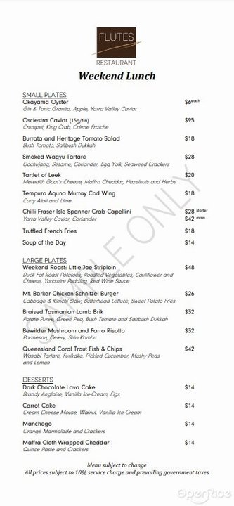 See pictures @ http://thehungrybunnie.blogspot.sg/2016/04/flutes-at-national-museum.htmlThe cuisine at Flutes is modern Australian, occasionally fused with a touch of Asian elements. Its elegant and sophisticated fare is reflected in the posh and swanky setting. That said, the vibe is relaxed, with nary a whiff of stuffy pretentiousness. We liked the service too, attentive but discreet, knowledgeable without being overbearing.We had:1) Queen Victoria's Green Pea Soup ($18): with a block of sockeye salmon mi cuit, creme fraiche to add creaminess, and lemon to lend a bright accent - loveliest green pea soup I've ever had. Velvety smooth, and amazingly complex, this, together with the next 3 mains, made it to the must-try list.2) Twice Cooked Spanish Suckling Piglet ($46): Skin had a satisfyingly crackling crunch, and the flesh was lusciously fork-tender. This was contrasted with a dollop of caramelised apple compote, toasted grains, radish, and cup of sherry jus.3) Chilli Crab Pasta ($38): with oodles of freshly shredded king crabmeat weaved into a roll of angel hair, and crowned with a gargantuan crab leg, was subtly spiced, redolent of crab essence, was fantastic.4) Pan Roasted Fillet of Barramundi ($42): incredibly crisp skin and moist flaky meat. This was set on a mashed potato bed, and served with rainbow heirloom tomatoes, rocket leaves, and a drizzling of olive emulsion.5) Grilled Margaret River Wagyu Striploin ($120 500gm for 2 to share): done to a medium-rareness as requested, and sided by a crisp peppery watercress salad and red wine jus - the only weak link of dinner. We didn't like the meat, which we thought too full bodied and this was quite forgettable.We opted for the accompanying sides of a beautifully caramelised casserole of Sweet Potato Dauphinoise ($12 ala carte price but complimentary with the striploin) and Roasted Broccoli ($12 ala carte price) sliced with a flavoursome sesame sauce and decadently plaited with smoked bacon lardons…查看更多