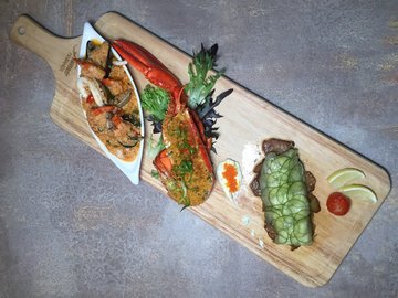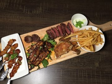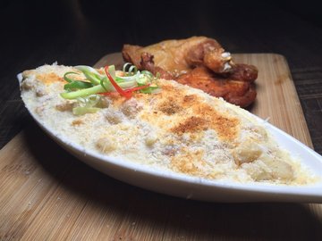 The place looked like a deli from outside with its rows of cheese on the counter. Walked inside one could not help but wow at the collection of wines and other drinks over the bar counter. For Wednesday night, there was also live band available. Order was taken through ipad. Looking through the menu, it had quite a number of 1-for-1 item during supper hours.Power Plank ($48++, usual price $55++)Oriental Ribs, Sirloin Steak, Mini Wagyu Patty, Chicken Steak, Chicken Skewers, Wasabi Mayonnaise FriesThe mini patties were so cute looking which I mistook them as meatballs. This platter was a must order for meat lovers which we demolished it in no time.Blue Cheese Burger ($20++)Wagyu Patty (Doneness : Medium), Blue Cheese Sauce, Bacon, Caramelised Onion, Roma Tomato, Cajun FriesThe sweetness of the caramelised onion went quite well with the moist juicy patty, but the blue cheese sauce was a bit too overwhelming. Chicken Mac & Cheese ($24++)Succulent chicken served over spatzle & cheeseInstead of the usual macaroni, spatzle which was a kind of soft egg noodle found in the cuisines of southern Germany, was used here. Not sure why, the dish was more on the sweet side, instead of usual savoury flavour which one expected from Mac & Cheese.Mushroom Risotto ($22++)Roasted Mushroom, Puree of Roasted Mushroom, Parmesan Cheese, Carnaroli RiceThe simple looking dish was well cooked with earthy flavours of the mushrooms in the mouth.The restaurant would be having a 3-course set meal($38++) for the month of December, which consisted of a choice of Appetizer, a choice of Main Course and a choice of Dessert.For Appetizer, there would be Butternut Squash Soup,Smoked Salmon Gravlax, The slices of smoked salmon was decorated like a rosette which made it too pretty to be eaten. Lightly and refreshing.Foie Gras SaladIt was a good balance between the buttery pan fried foie gras, the sweetness of the fruit and crispiness of the vegetables.For Main Course, Prime Rib with Roasted Pumpkin & Chestnut,The brownish pile of braised chestnut offered a surprising sweet and nutty flavour which interesting to go with the tender juicy meat.Chicken Roulade & Silky MashAlthough looking much plainer comparing to the other main course, the dish held itself quite well.For Dessert,Toffee Pudding,The pudding reminded one of sticky date pudding, which was moist and served with toffee and cream sauce. Personally one would prefer it to be served hot with a scoop of ice cold vanilla ice cream by the side.Christmas CakeThe cake looked like a slice of log cake, served with slices of strawberries. It tasted like coffee sponge with oreo filling.Another upcoming dish in December would be the Seafood Platter, which consisted of half lobster topped with crispy parmesan crusted minced garlic , seafood couscous and pollock fish. For seafood lovers, the couscous would be the favourite as it filled with lots of juicy seafood such as prawns, mussels, clams, and calamari rings. The pollock was interestingly served on top of soften slices of potato.…查看更多