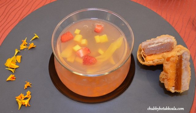 Golden ‘Nian Gao’ with Sweet Potato and Yam Chilled Lemongrass Jelly with Aloe Vera and Jack Fruit in Sour Plum Juice.