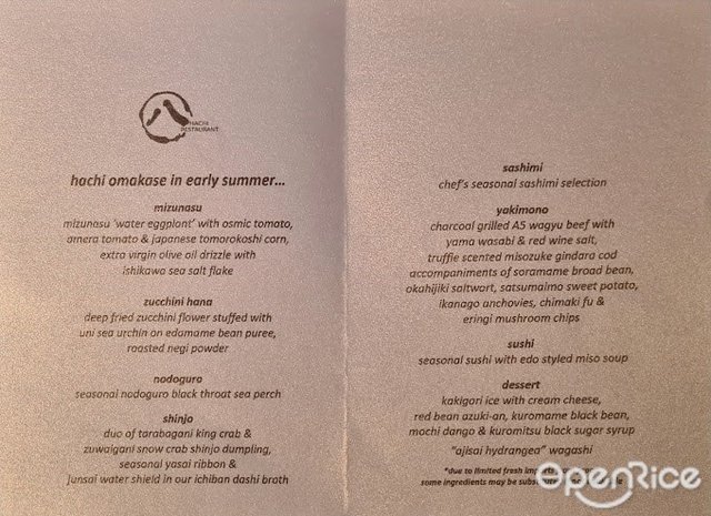 Hachi Restaurant (新加坡) 網址: https://s.openrice.com/eKbSB01ipC200 地址: National Gallery (Supreme Court Wing), 1 St Andrew’s Road, #01-02/03, City Hall, Singapore 電話: +65 6734 9622