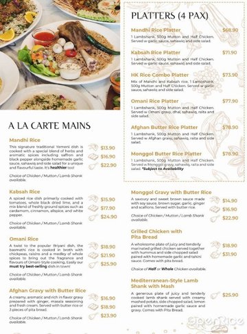 我們為您提供最好的中東融合烹飪,以及我們自己的也門和地中海起源食譜,這些食譜是家族代代相傳的。我們精選的招牌菜餚如 Mandhi、Kabsah 和阿曼大米均採用樸素的食材新鮮烹製,代表了我們的文化遺產。芳香的香料、鬆軟的米飯和足量的慢煮肉類——我們的烹飪理念一定會為您的同伴創造難忘而充實的共同體驗。所以,是時候拿起盤子來提升您的感官了!歡迎大家來到我們的廚房。