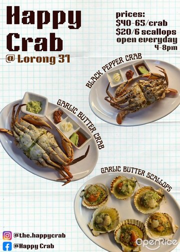 Happy Crab (新加坡) 網址: https://s.openrice.com/eKbSB01g18100 地址: 611 Geylang Rd, Singapore 389550, Geylang, Singapore 電話: +65 9618 8713