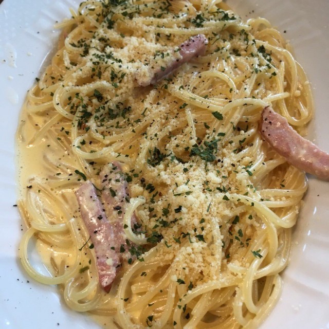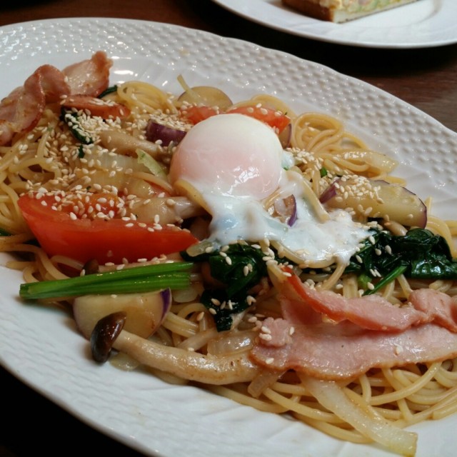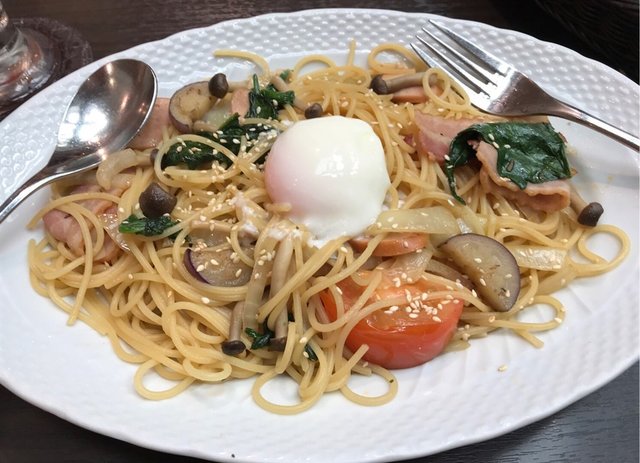 Hoshino Spaghetti with Eggplant, Bacon, Shimeji and Sausage