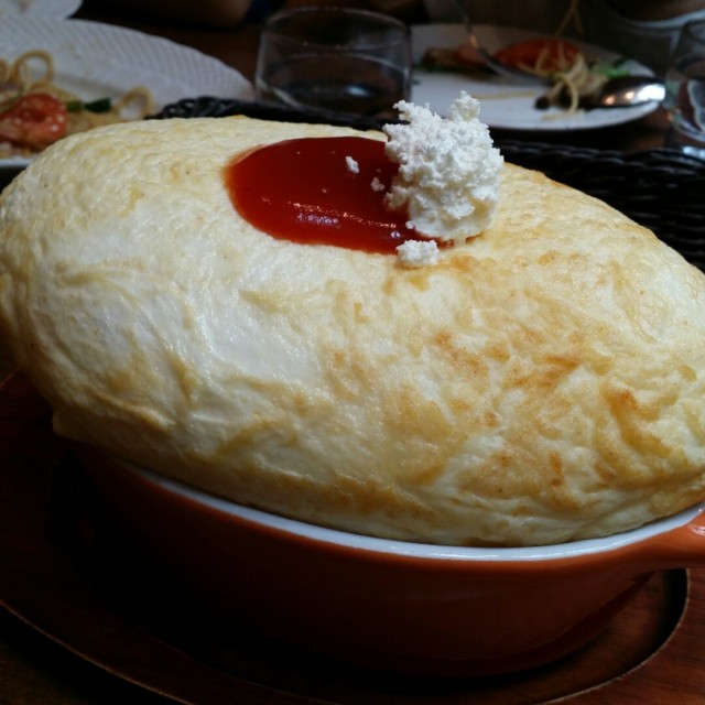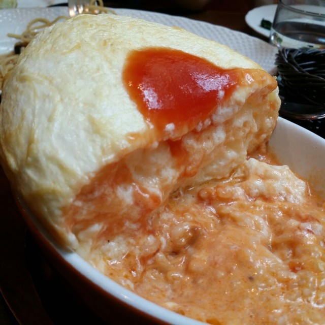 Omu Soufflé Tomato Risotto with Shrimp and Brocolli