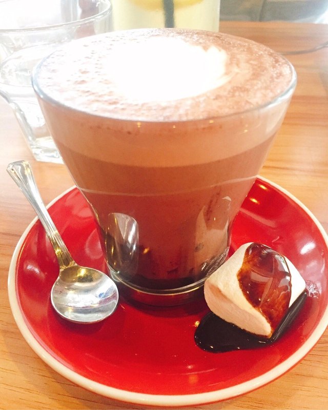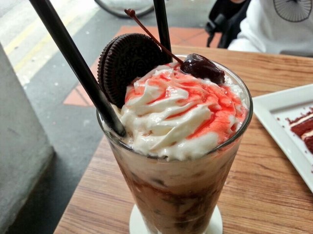 My friend and I was around the area and decided to dine here. It was pretty awkward as the queue was at the next building. Hard to tell if they were queueing for seat at the shop. But since we were smart, we deduce that people would not line up at there for nothing and that it had to be the queue for I AM. The waiting time was not as long as we had expected and pretty soon it was our turn. The waiter led us to a table and handed us the menu. We only wanted to try their cakes but their menu did not have them. We just looked at what was display and ordered what we wanted.The waitress took our order and we waited for our orders to arrive. After a very long time our drink- Stir It Up($6.90), finally arrive. Chocolate-milkey drink topped with whipped cream and maraschino cherry. Apparently this is one of their signature dish. I didn't llike the taste at all. It wasn't really chocolatey, more of a weird milky, minty, mild taste of cocoa kind of drink. The only nice about the drink is the oreo and cherry. Even the table next to us who ordered the drink did not like it. Next came the Scarlett Red Velvet Cake($8.90). The cake was quite dense and tasted a little like chocolate. The frosting was cream cheese. I think it's quite nice and it taste a lot better than the crepe.Lastly came the Rainbow Mille Crepe Cake($8.90). I think the crepe tasted quite plain. There was not much cream in between each layer. Luckily there was some chocolate sauce at the side which help added some chocolatey sweetness to the crepe. …查看更多