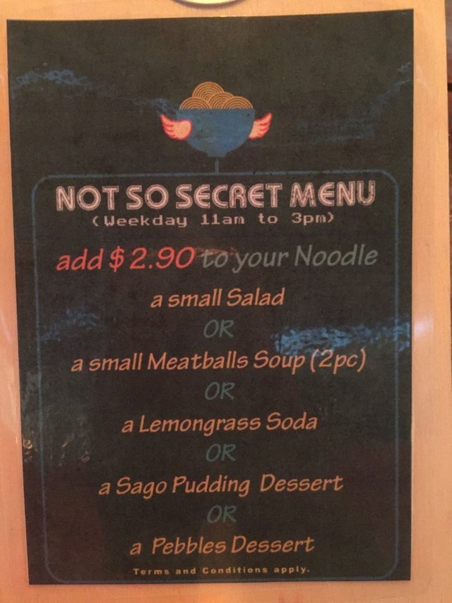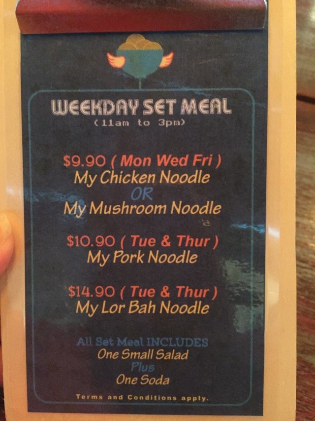 The causal restaurant is located at the 3rd floor. Although it is lunch time, the place is quite empty. The place has an open dining in concept. The restaurant has weekday set menu with a topup menu.Weekday Set Meal ($9.90)Today the restaurant is having a weekday set meal which consists of My Chicken Noodle, one small salad and one soda. This all is for just $9.90 nett, which sounds like a great deal.My Chicken Noodle (usual $7.90)The noodle has a QQ texture, which reminds curly, hard, not as springy as the usual wanton type. It is made fresh daily in Indonesian style. Chilli paste is served separate in the spoon. If that is not enough for you, there is sliced chilli on the table to help yourself to. The noodle comes with a bowl of soup with a slice of radish in it. The soup is a bit too peppery.SaladThe spinach is dressed in light dressing and tastes light and crispy.Sago Pudding Dessert ($2.50 topup)Although there is a topup menu, the female staff at the counter refuses to let me topup. She says that she will charge me for ala carte prices should I wish to do so, although I have showed her the menu. In the end, I have to wait for a change of staff at the counter before sucessfully getting my request. So troublesome. The sago is light and does not taste too sweet with the gula melaka syrup.Overall the food is not bad except for my bad experience with the female staff.…查看更多