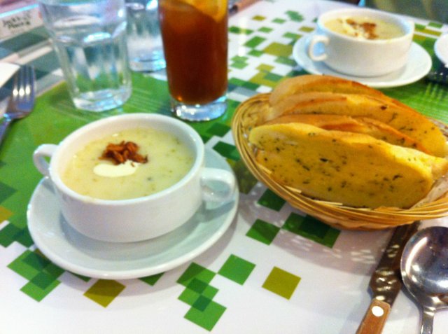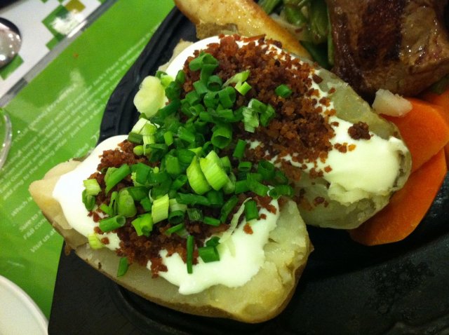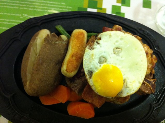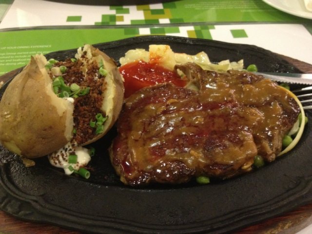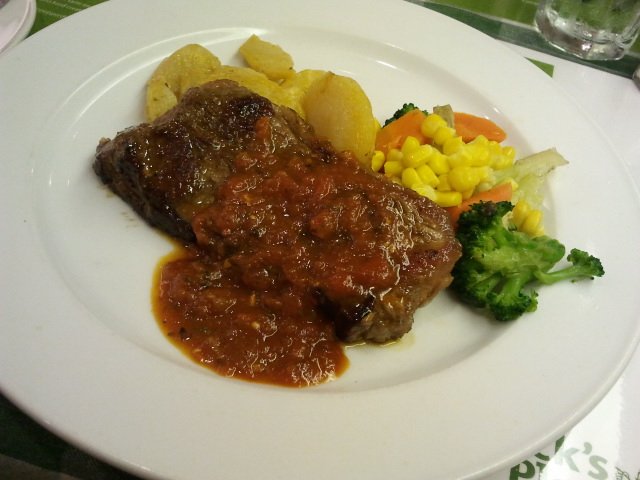 I went to Jack's Place for lunch a few weeks back. As I was caught up in a jam, I left it to my wife to place my order for me. I indicated that I wanted to have steak, so she got the steak for me. I am not very sure what is the sauce that was poured over the steak but it is quite tasty. The sauce is tangy and it went well with the earthly taste of the beef. The beef was cooked medium well and I am quite glad that the chef cooked it well such that there is no blood when I cut into the beef but yet the beef still retains its tenderness. The dish comes with potato wedges and vegetables. I think the broccoli could have been more as there are just two florets of it. The set lunch comes with garlic bread, tea/coffee and dessert of the day so it is quite comprehensive and affordable with my set costing only $13.90++. …查看更多