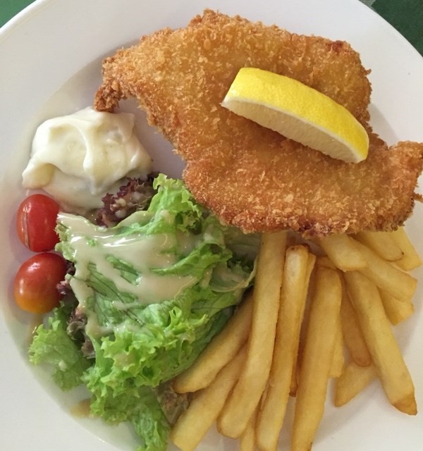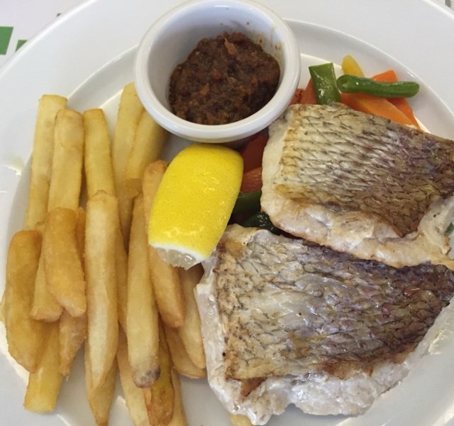 Grilled Fish with mango salsa sauce topped with crispy calamari
