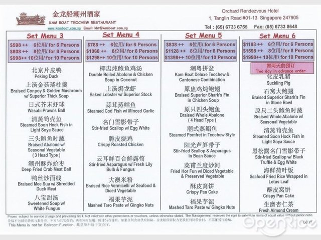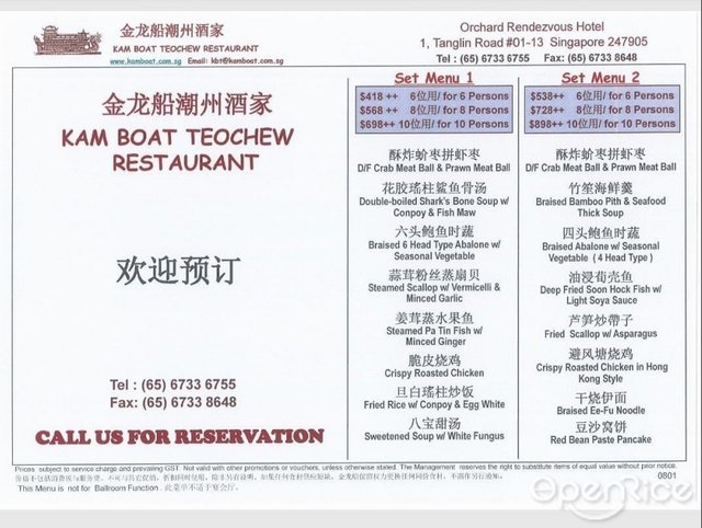 Kam Boat Teochew Restaurant (新加坡) 網址: https://s.openrice.com/eKbSB014O8000 地址: Orchard Parade Hotel, 1 Tanglin Road #01-13, Orchard, Singapore 電話: +65 6733 6755