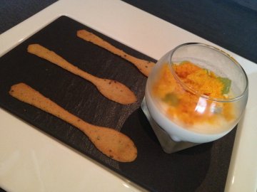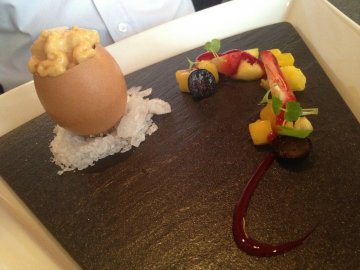 After a short break from this fine diner, I am back to try more of their dishes. This time, it was through a friend's suggestion. One fine day, we will definitely conquer the entire menu!!First on the list is, of course, their yummy Rosemary and parmesan garlic charcoal bread. There's no better way to start the meal than a warm, sweet smelling bread with their soft butter.The next item that was served to us was the Irish oyster with tsukiji seaweed. The presentation alone was impressive. The sweetened taste of the oyster is something different from the tobasco sauce and lemon juice taste I normally have.For starters, I ordered the Jamon Iberico with black mission figs, reblochon, passionfruit quenelle and rockmelon gel. This is a must have! It was quite a good idea to include the passionfruit quenelle as palette cleanser because the taste from the meat was quite strong.My friend had the Snake river farms pork belly with kakuni, blood orange & chili jus, yukon chip and karashi paint. I must say that the presence of the yukon chip was quite fascinating. If not for the fact that this wasn't the dish I ordered, I would have finish the chips for my partner. The meat was soft and it simply melts in your mouth! I would love to order this dish the next time I come.For main course, I had the Green eggs & pulled pork with agria espuma, atsina baby cress and tsujiki seaweek soil. I know I had this the previous time I was there but hey, if the dish is good, I wouldn't mind stuffing it into my stomach again! And it is still good. The softness of the pork aids in the speed I put the meat into my mouth. If I have the stomach for 2 main course, I certainly wouldn't hesitate to do that.My friend ordered the Blackmore wagyu slider with grilled mantou, aged English cheddar, vine-ripened tomato and mustard rémoulade. Didn't get to taste it but I like the east meets west presentation. I never thought that anyone could have mix the chinese mantou into a french cuisine! To end the meal, I had Silken curd with mikan mandarin, compressed thompson grapes and vanilla bean. The curd is smooth and slides down your throat easily. The fascinating part was the dehydrated mandarin. It was almost like sugar but with a tinge of tangy taste. The curd alone was abit blend but with the sweetness of the mandarin and grapes, the overall taste was almost perfect!My friend has the 360 Brulee texture with caramel custard foam, salted maple and valrhona equatoriale. This is still my favorite dessert not only because the brulee was presented in an egg shell, but because I am still impressed with the way the entire brulee was inverted and stuffed into a shell! Since it's inverted, the best way to eat it is to plunge your spoon all the way inside the egg (touching the bottom) and make up way up!I still feel that the food and service is worth every cent. Not because they remembered what I ordered before but their personal service and the ambiance made my friend and I really comfortable. On the whole, it was another excellent dining experience!…查看更多