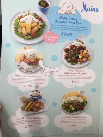 From 17 May to 13 August 2017, the cafe was reopened as a Cinnamoroll character pop up cafe. The place was decorated with the cartoon characters all over the place, with a soft toy at each table. Tables were placed quite neat each other. Although it was about 15 minutes, there was already a long queue in front of the cafe. On the menu, one could not help but noticed there was a minimum order of $10 per person with a limited 90 minutes for dine in. Fluffy Dreams Japanese Curry Rice ($21.90+)Get carried away with Cinnamoroll fluffy Japanese rice. Accompanied by Kumoya's signature Japanese curry, fresh tempura salmon and mixed salad with cherry tomato.As the rice was pressed tightly to formed the character shape, it was a tab dry and hard. Would prefer that the curry was served hotter, and serving the salad with some dressing on. It looked pretty dry.Flying Clouds Cinnamoroll Burger ($17.90+)Bite into a juicy crispy chicken katsu sandwiched between crunchy vegetable and fresh tomato on a cute cinnamoroll mantou burger. Served with potato chips with nacho cheese and chicken ham, fish cakes and mixed salad. The ears were made of sugar sheets. Stuffing them into the burger to eat together, kind of made the burger sweet and crunchy. Flying the Clouds Yuzu Chiffon Cake ($15.90+)Fly away with cinnamoroll with this yuzu infused chiffon cake, accompanied by fresh cream with mixed berries and fluffy cotton candy.The cake was a tab dry with the filling a tab too thin and tasted too tart.Sweet Heart Iced Chocolate ($8.90+) Perfect for your sweet heart. Kumoya's popular iced chocolate served with a special cinnamoroll cookie, heart shaped marshmallows and topped with whipped cream.It looked cute although the whipped cream was a tab too much.Kiss Me Sweet Cafe Latte ($8.90+)Nice hot latte brewed to perfection from UCC Japanese coffee beans.The drink was lacking of the coffee's aroma and taste. By the way the cafe did not served water. One had to proceed to the cashier to place order. So do take note of your table number before placing order. The place could be a tab too noisy.…查看更多