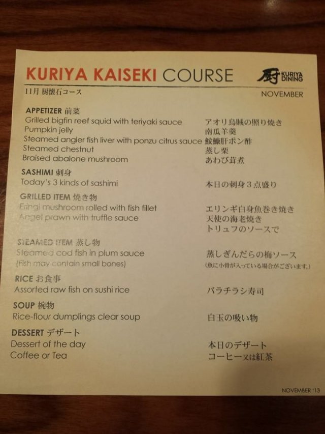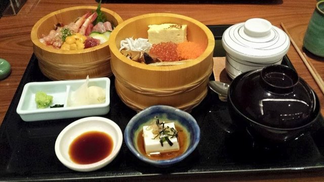 See my full reviews & photos at = http://chefquak.com/2015/06/10/excellent-chirashi-don-set-kuriya-dining-on-9jun2015/wife bought me an excellent chirashi sushi zen set at lunch at kuriya dining on 9.6.2015.^^ it was for early father’s day. we had a mother’s day lunch at gurnard’s head on 10.5.2015 and a mother’s day dinner at mackerel sky at newlyn, cornwall. set started with a salad with goma (sesame) dressing. there was a lot of salad, a bit little dressing. we asked for more. of course to be added in moderation. it was good.the chawanmushi was excellent, especially with the very tasty snow crab sauce, though i felt the sauce was a bit starchy. this was an excellent chirashi don for S$62++. i still cannot decide if this is better or mikuni’s better. i guess overall i still favour mikuni’s chirashi don but this was really really good too. anyway, i like them both. you have in one bamboo holder uni, negi toro, salmon, tai, maguro, hotate, hamachi, amaebi on a bed of cubed salmon & maguro (like in barachisrashi don). on the other there was anago, ikura, tobiko, tamago on sushi rice. a most wonderful, satisfying lunch. there was dessert & coffee too. dessert was strawberry mousse, black sesame ice cream, and fruits. it’s actually kind of huge set for lunch, but on some days we are permitted to spoil ourselves.…查看更多