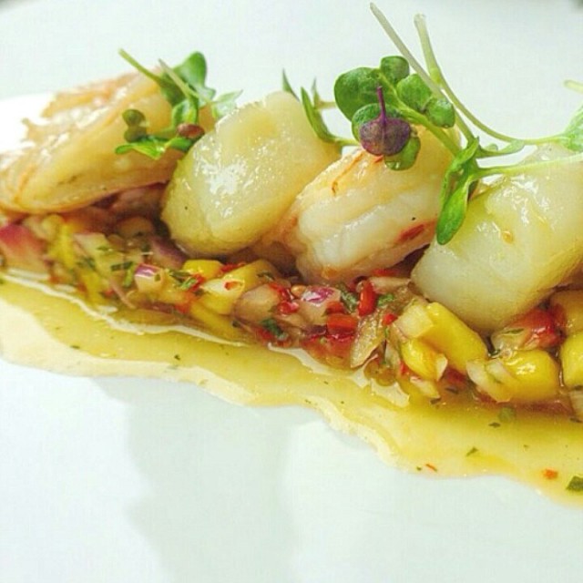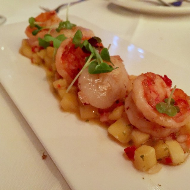 scallop and shrimp with mango strawberry salsa