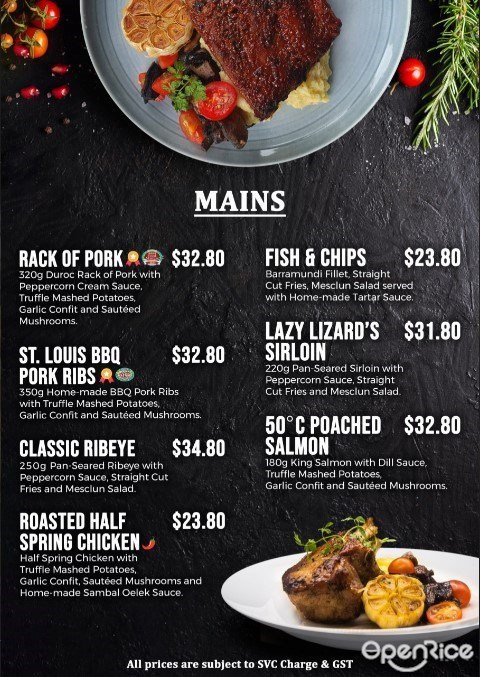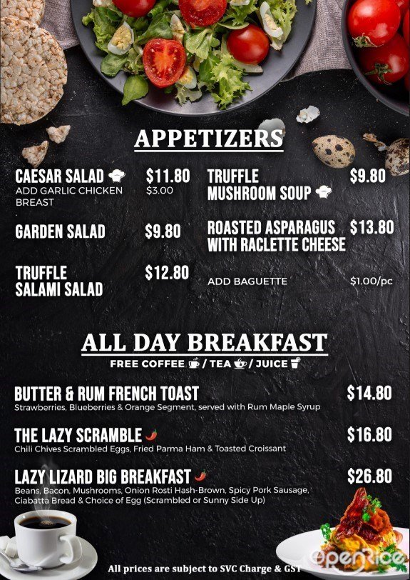 Lazy Lizard (新加坡) 網上訂座即賺Rice Dollars 網址: https://s.openrice.com/eKbSB01dyO100 地址: Flora Vista, 7 Ang Mo Kio Street 66 #01-09 & #01-12., Ang Mo Kio, Singapore 電話: +65 6363 9789