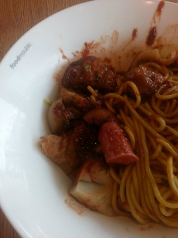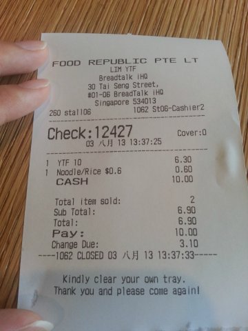 The stall front of Lim's Yong Tau Foo looks quite interesting especially with the modern display array of Yong Tau Foo under the rustic looking shelters.Chosen 10 items out of a wide range of Yong Tau Foo (YFT) together with Yellow Mee at the cost of S$6.90 altogether. The average cost for per piece of YTF is about 63 Cents. Standard of YFT was pretty common. We ordered the dry version and had them covered with a few scoops of sweet sauce.For soy beans lovers, you can add the soy beans into your soup, its free flow.Food Republic had this pasted on every table to encourage customers to return their tray after use and not to bring outside food.Total Spending for lunch: S$6.90…查看更多