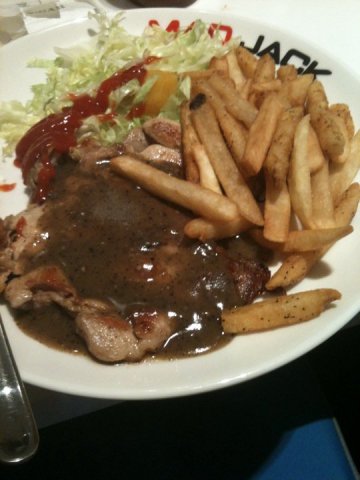 Just like usual chicken chop dish, it includes a chicken chop, fries and salad.Without the fantastic sauce, it might taste just like any other tender chicken chop you can find in a western food stall. The black pepper gravy really has a lot peppery taste and went really well with the tender chicken chop, fries and salad.The fries has the type of thickness that I like and since it contains black pepper bits, definitely a plus for me.The salad itself taste ordinary but thanks to the black pepper sauce, it taste more special.…查看更多